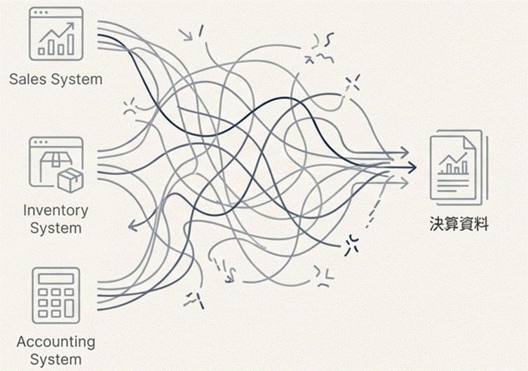現代の企業では、財務情報や業務データが複数の部門やシステムに分散して管理されていることが一般的です。たとえば、営業部門では売上や売掛金の管理を販売管理システムで行い、購買部門では仕入債務や在庫を購買・在庫管理システムで記録し、経理部門では会計システムで総勘定元帳を管理するといった構造です。