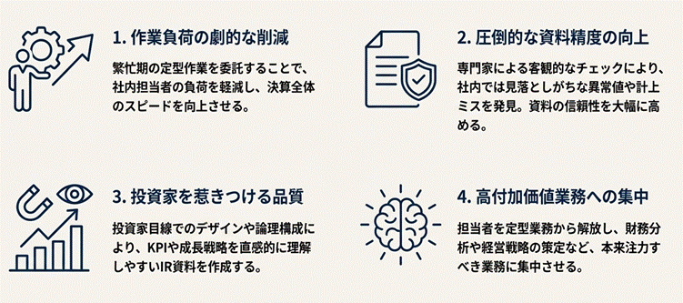 これまで解説した課題を解決する手段として、決算資料作成の効率化と外注活用は非常に有効です。ここでは、その具体的なメリットについて解説します。