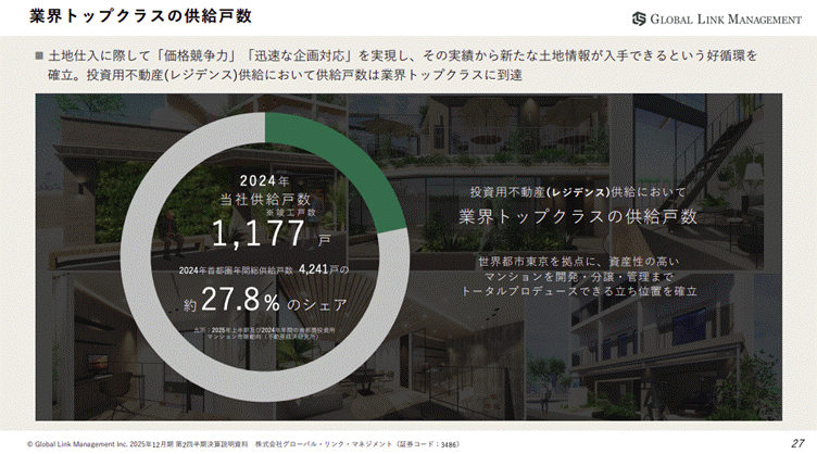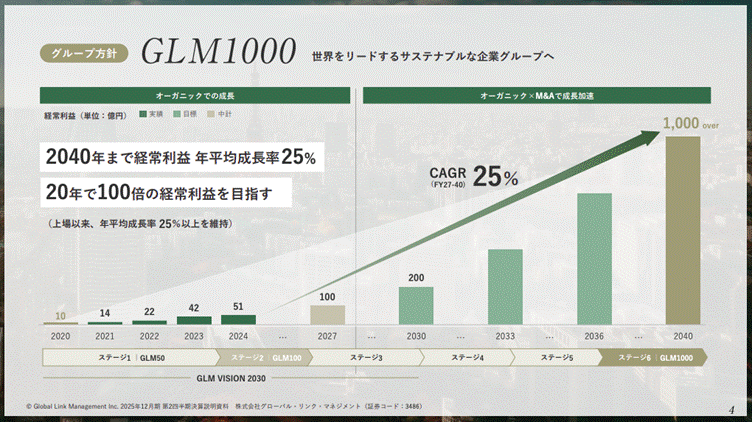 グローバルリンクマネジメント株式会社の資料は、情報量の多い内容であっても、シンプルなグラフと要点を絞ったメッセージを組み合わせることで、視覚的にわかりやすい構成となっています。